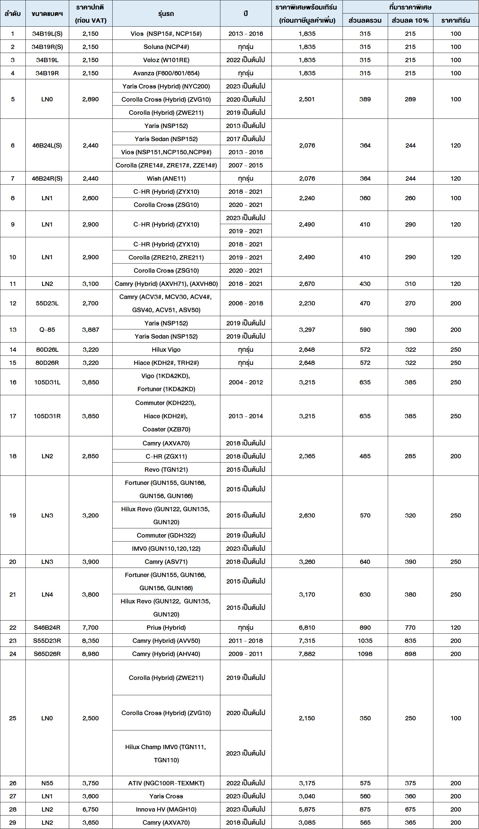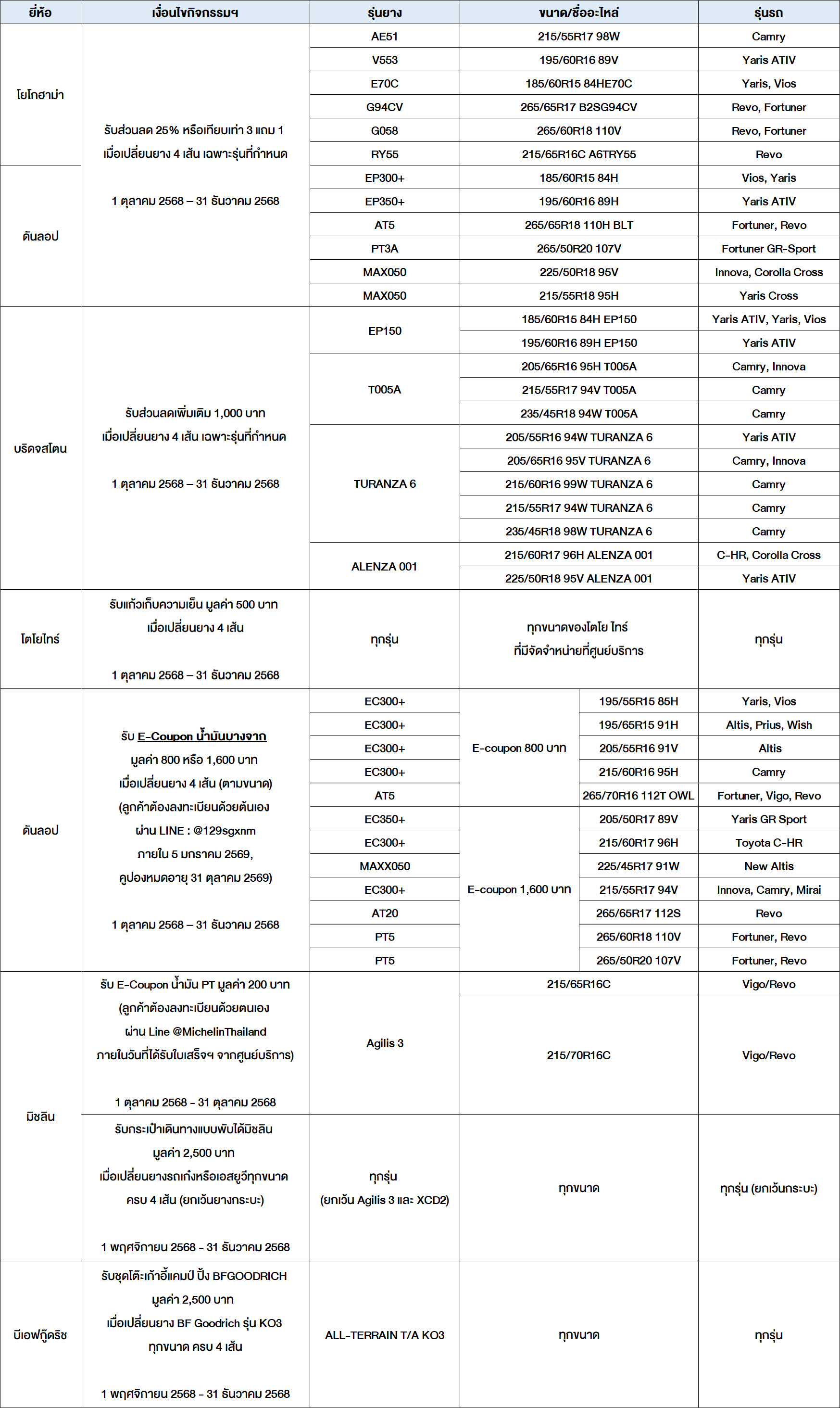 ฟีลดีๆ ทุกระยะ ยิ่งเข้าศูนย์ฯ รับคุ้มทุกไมล์ ยาง 3 แถม 1 หรือส่วนลดตามขอบยางสูงสุด 2,000 บาท วันที่สร้าง : 2025-10-02 15:33:11 ดู : 68 ครั้ง ฟีลดีๆ ทุกระยะ ยิ่งเข้าศูนย์ฯ รับคุ้มทุกไมล์ ยาง 3 แถม 1 หรือส่วนลดตามขอบยางสูงสุด 2,000 บาท หมายเหตุ ส่วนลดสำหรับการเปลี่ยนยาง (1 ตุลาคม 2568 – 31 ธันวาคม 2568) ส่วนลดยางรถยนต์ตามขอบยาง ทุกยี่ห้อ ทุกรุ่น ทุกขนาด เมื่อเปลี่ยนยาง 4 เส้น ขอบ R14 R15 R16 R17 R18 R19 R20 ส่วนลด 1,400 1,500 1,600 1,700 1,800 1,900 2,000 ส่วนลดและโปรโมชันเพิ่มเติมสำหรับยางรถยนต์เฉพาะรุ่น (สามารถใช้ร่วมกับข้อ 1 ได้ ยกเว้น ยี่ห้อโยโกฮาม่า และดันลอป ที่มีกิจกรรมส่วนลด 25% หรือ 3 แถม 1) ฟรีค่าแรงเปลี่ยนยาง ตั้งศูนย์และ ถ่วงล้อ ฟรีรับประกันอุบัติเหตุยาง 1 ปี หรือ 20,000 กิโลเมตร เมื่อเปลี่ยนยาง 4 เส้น รายละเอียดเพิ่มเติม https://aftersales.toyota.co.th/promotion/tyres_guarantee บริการช่วยเหลือฉุกเฉิน (Roadside Service) เมื่อลูกค้าเปลี่ยนยาง 4 เส้น พร้อมลงทะเบียน TCFR Plus+ รายละเอียดเพิ่มเติม https://aftersales.toyota.co.th/promotion/roadside หรือ แอปพลิเคชัน T-Connect ส่วนลดสำหรับการเปลี่ยนแบตเตอรี่ (1 ตุลาคม 2568 – 31 ธันวาคม 2568) ส่วนลดสำหรับแบตเตอรี่แท้โตโยต้าพร้อมเทิร์น 10% เฉพาะรายละเอียดตามตารางด้านล่าง ราคาพิเศษพร้อมเทิร์น สำหรับลูกค้าที่ซื้อแบตเตอรี่รุ่นที่กำหนดพร้อมเทิร์นแบตเก่าเท่านั้น หากลูกค้าไม่ประสงค์เทิร์นจะไม่ได้รับส่วนลดจากกิจกรรมฯ