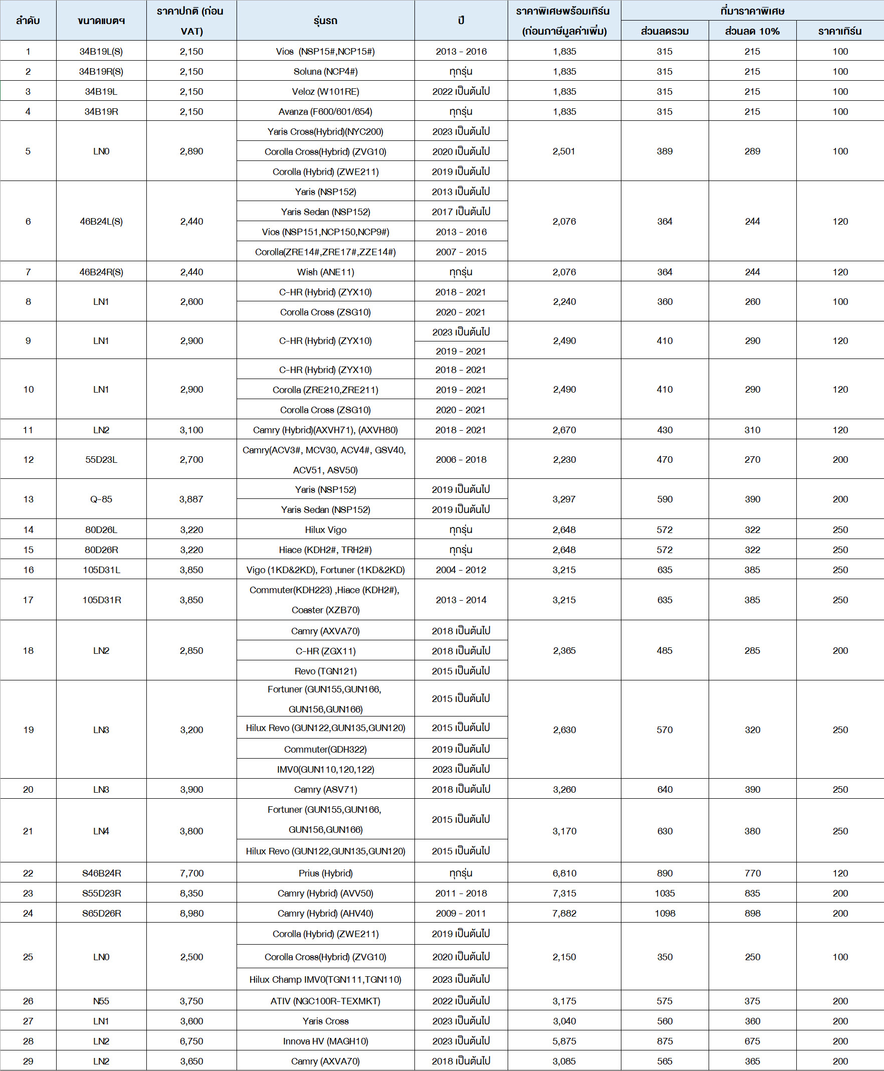 ฟีลดีๆ แบตฯ ลดคุ้ม จัดเต็มทุกระยะ วันที่สร้าง : 2026-02-02 15:52:26 ดู : 12 ครั้ง ฟีลดีๆ แบตฯ ลดคุ้ม จัดเต็มทุกระยะ เงื่อนไขโปรโมชัน ฟีลดีๆ แบตฯ ลดคุ้ม จัดเต็มทุกระยะ ส่วนลดสำหรับการเปลี่ยนแบตเตอรี ( 1 กุมภาพันธ์ 2569 – 31 มีนาคม 2569) ส่วนลดสำหรับแบตเตอรี่แท้โตโยต้าพร้อมเทิร์น 10% เฉพาะรายละเอียดตามตารางด้านล่าง ราคาพิเศษพร้อมเทิร์น สำหรับลูกค้าที่ซื้อแบตเตอรี่รุ่นที่กำหนดพร้อมเทิร์นแบตเก่าเท่านั้น หากลูกค้าไม่ประสงค์เทิร์นจะไม่ได้รับส่วนลดจากกิจกรรมฯ ฟรีค่าแรงเปลี่ยนแบตเตอรี และ รับประกัน 1 ปีไม่จำกัดระยะทาง